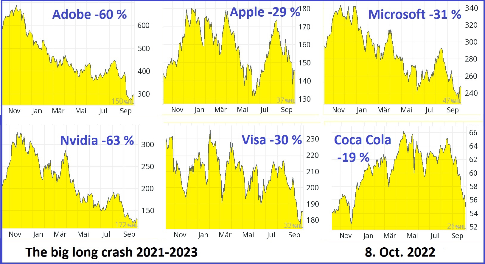 Také čeká propad na 1/3 na akcie Apple, Coca Cola, Microsoft, Visa. Bude rozumné ten propad vyřídit během roku 2023, aby se mohly tyto akcie 2024