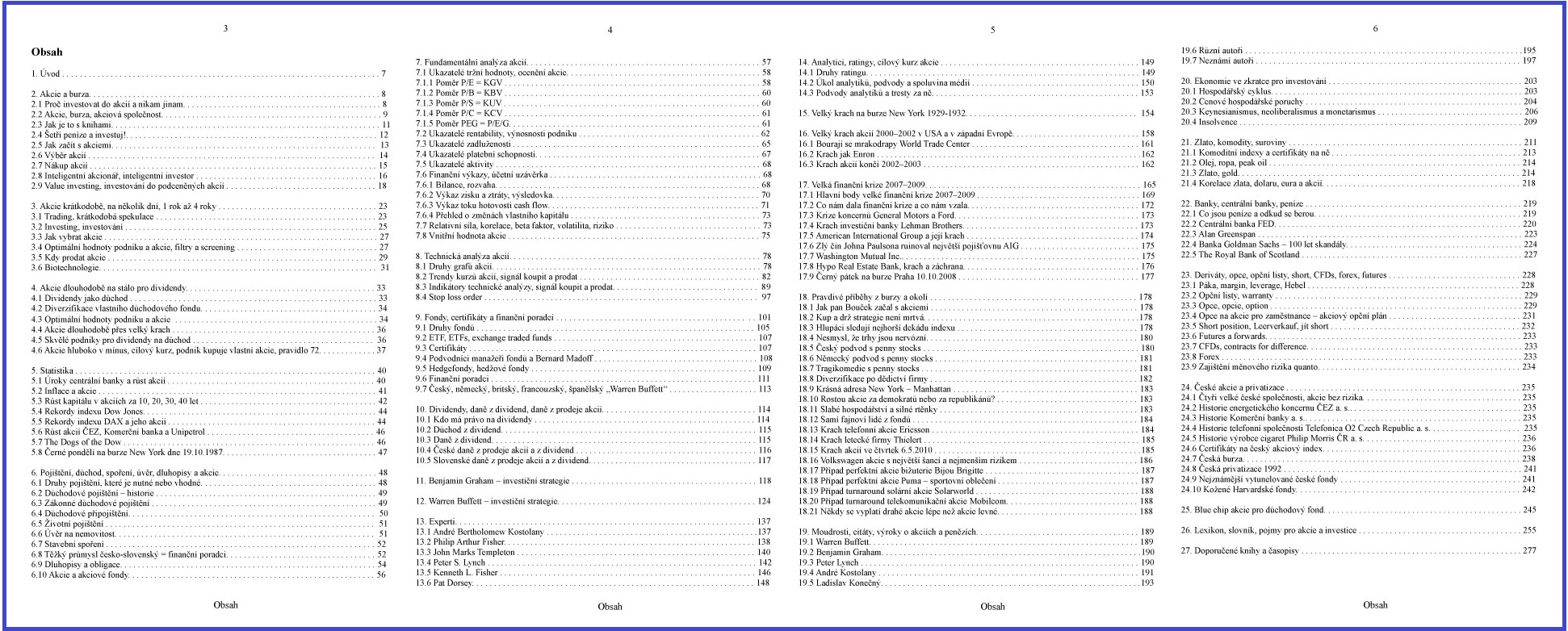 fondech, pojištění a důchodu. Je zde malá lekce ekonomie pro investory. Kniha obsahuje sbírku moudrostí o akciích, penězích a burze. Je zde historie
