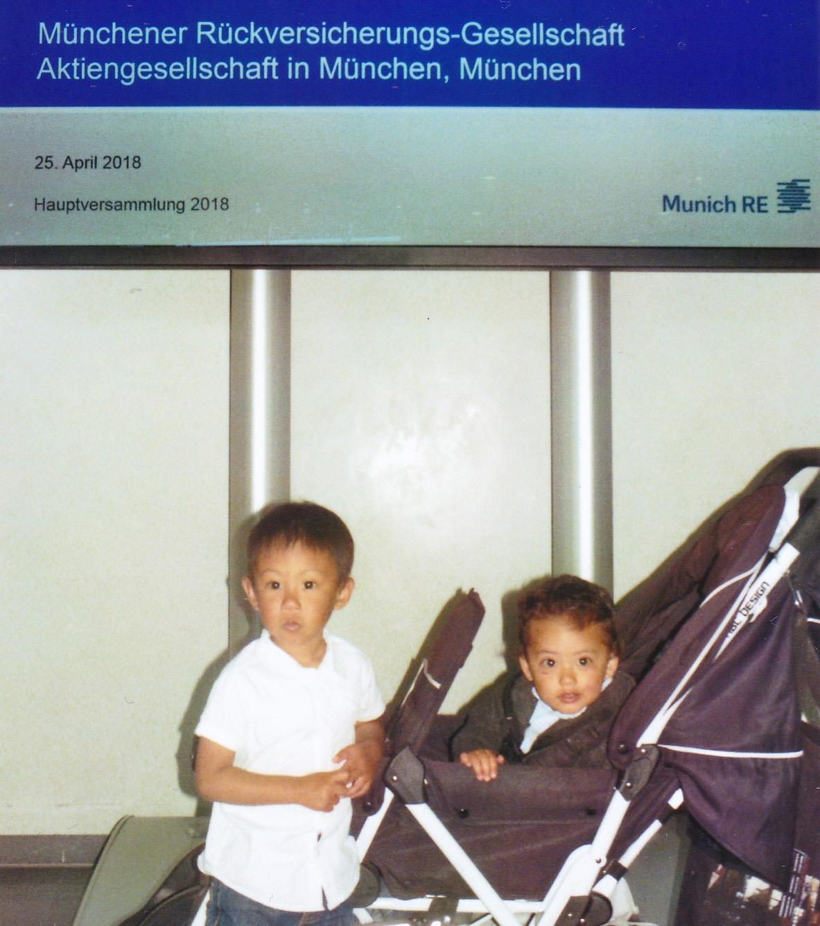 Akcionáři Bill Konecny a Joe Konecny of mine, byli na shromáždění akcionářů Munich Re roku 2018 s kočárkem.