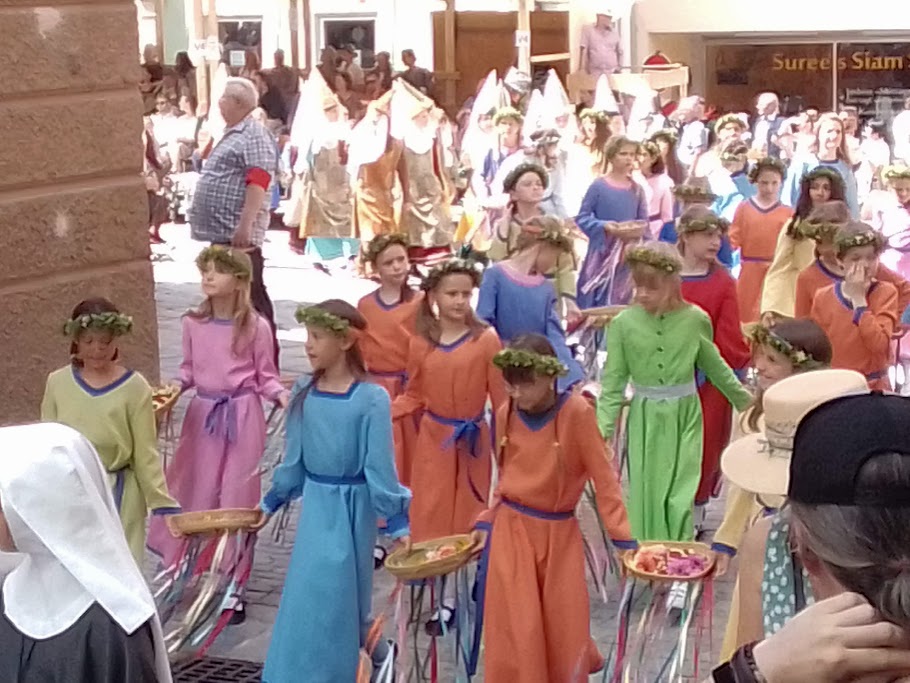 Průvod sředověce oblečených dětí a lidí a muzikantů končí kilometr od městských hradeb na velkém prostoru s kolotoči a s velikou hospodou pod
