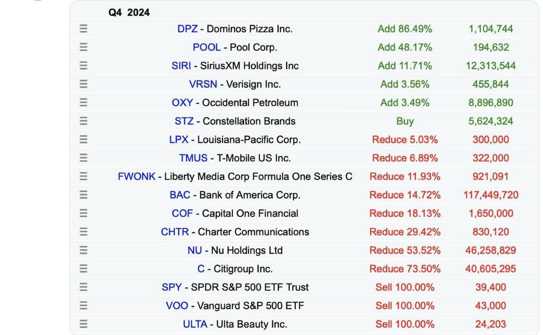 Zmenšení pozice: Amazon, Apple, Atlanta Braves Holdings, Bank of America, Constellation Brands, DaVita, Pool, Aon, Liberty Latin America.