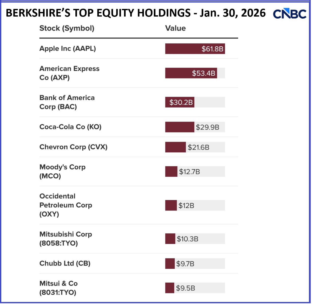 :punk: Největší pozice akcií v Berkshire Hathaway portfoliu: Apple, American Express, Bank of America, Coca Cola, Chevron, Moodys, Occidental Petroleum, Chubb, Kraft Heinz, Alphabet.