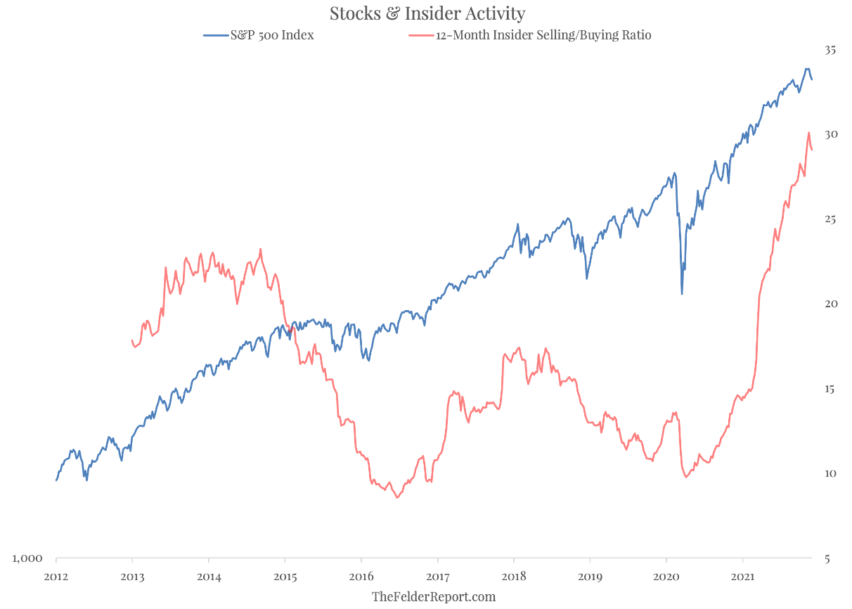 Obraz: modrá křivka je růst indexu S&P 500, červená křivka ukazuje rostoucí množství prodaných akcií od insiderů, manažerů, kontrolorů a