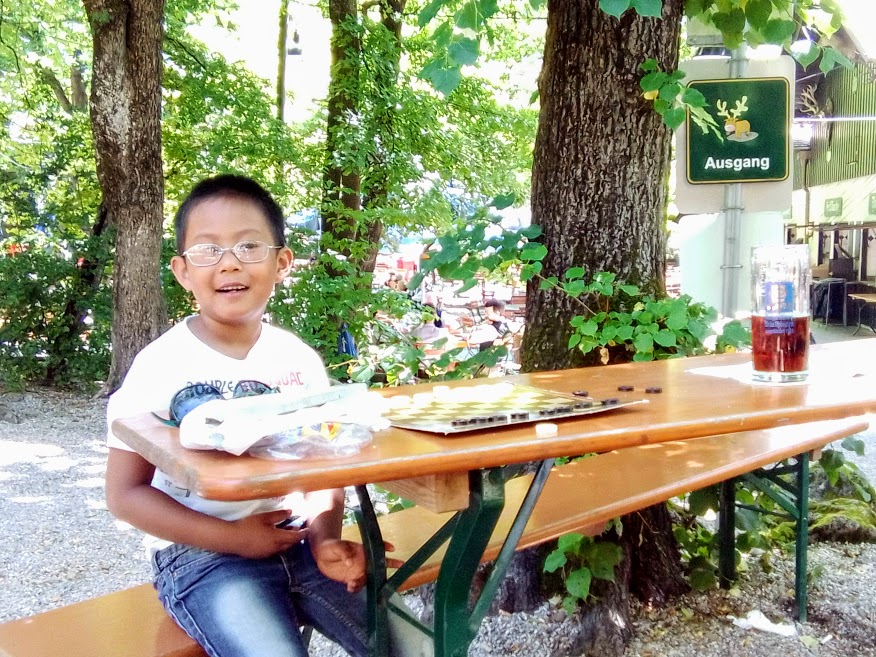 v zahradě Augustiner Keller, Arnulfstr. 52, u stolu nebo stolů vedle dětského hřiště.
