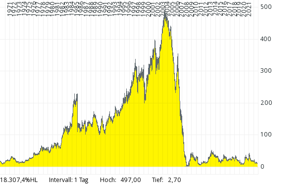 takže hrozí spíš bankrot než růst kurzu +100 %. A YouTube filmař neláká na +100 %, ale na +1.900 %. V letech 2004-2009 klesla akcie na 1/184, ze 497