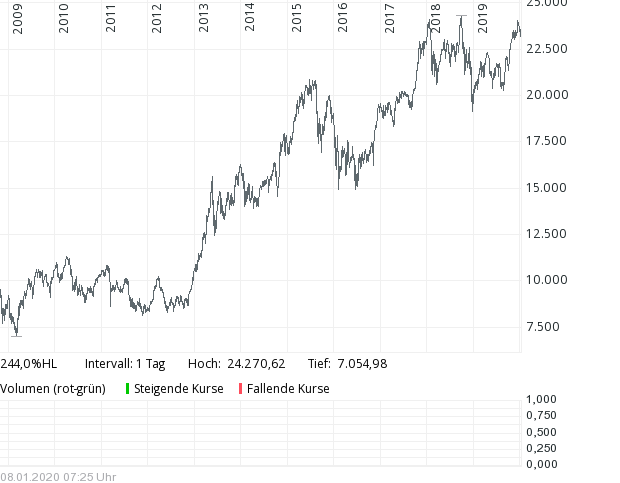 Nedávné minimum 7.059 bodů roku 2009.