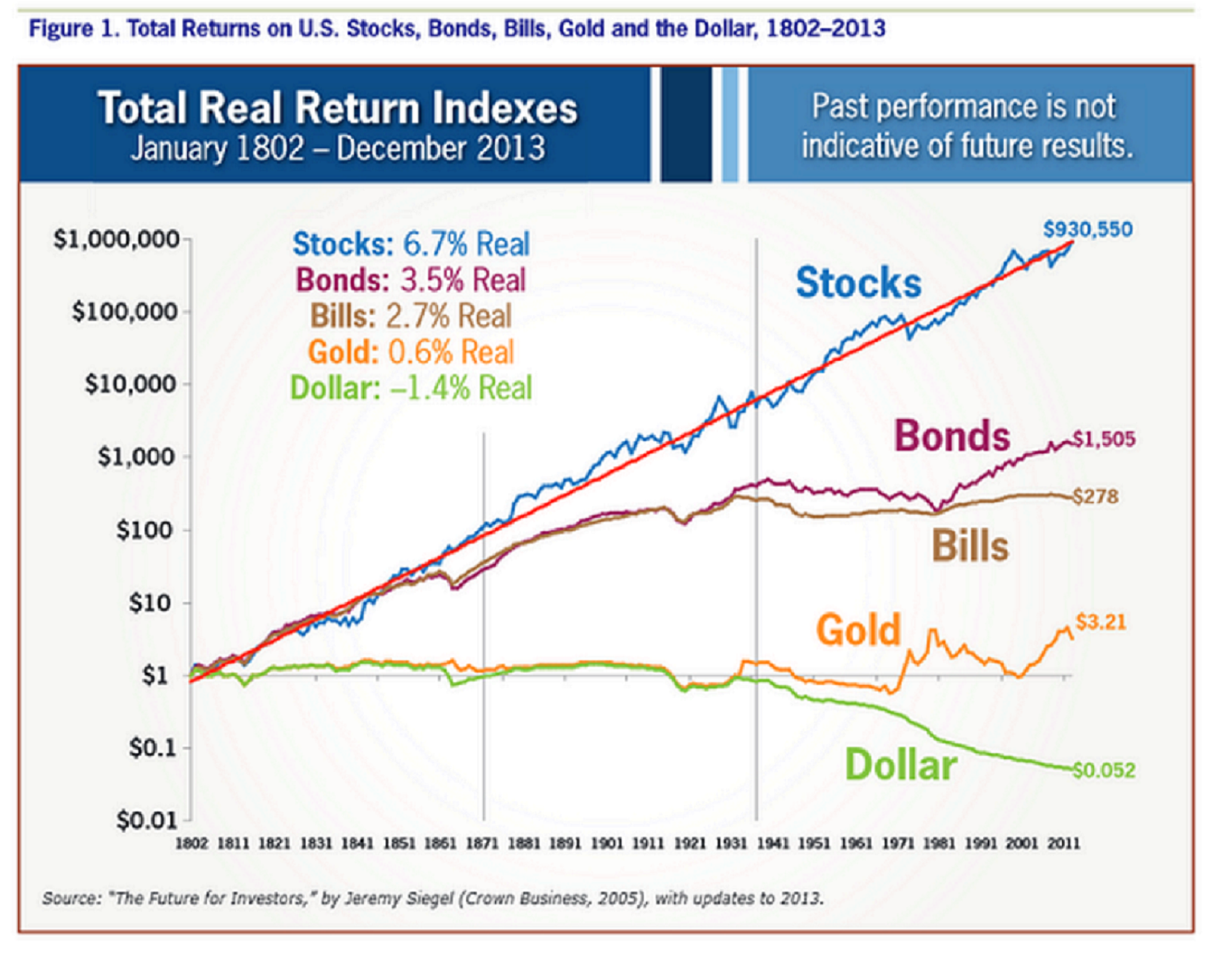 Srovnání výkonnosti jednotlivých aktiv za posledních cca 200 let (1802 až 2011) publikované i v knize od Jeremy Siegela - Stocks for the long run