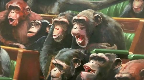 Roku 2009 se byl v britském parlamentu podívat malíř Banksy a pak namaloval tento obraz 2,5 m x 4,2 m velký - Devoted Parliament.