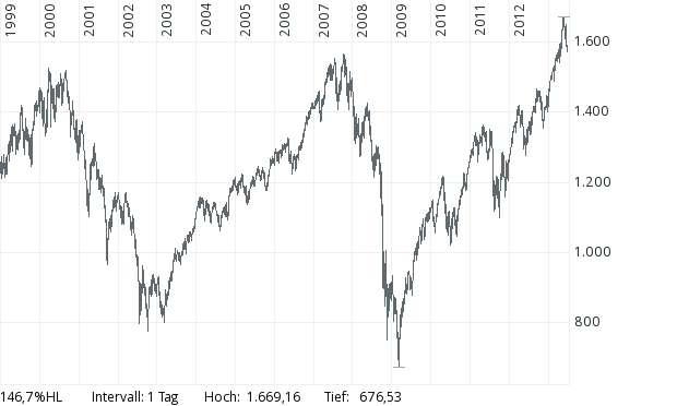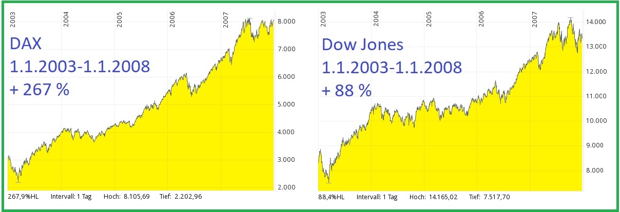 Performance od minima 2003 do maxima 2008: Dow Jones 84 %, DAX 267 %, Eurostoxx50 146 %, Stoxx50 109 %.