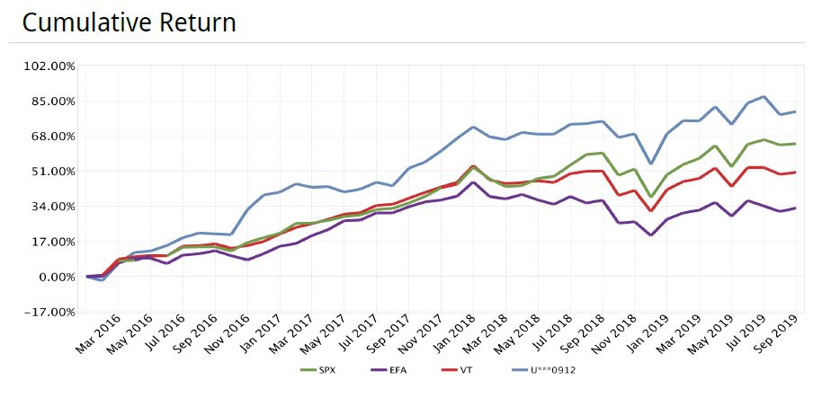 Níže je například výkonnost takové strategie založené na držení pouze čtyř relativně nejvýnosnějších málo korelovaných aktiv na trhu v době