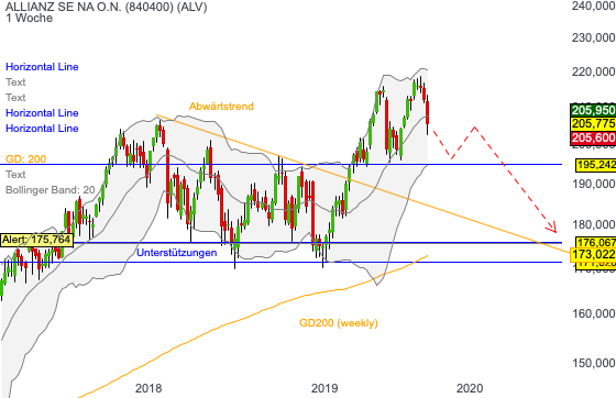2.8.-14.00, Allianz, Bollinger bands, SMA 100, 200