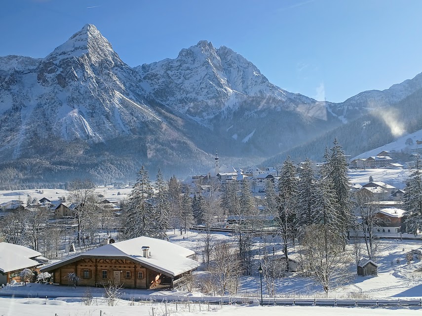 Jizda vlakem z Reutte in Tirol na Ehrwald pod Zugspitze. 25.12.2024.