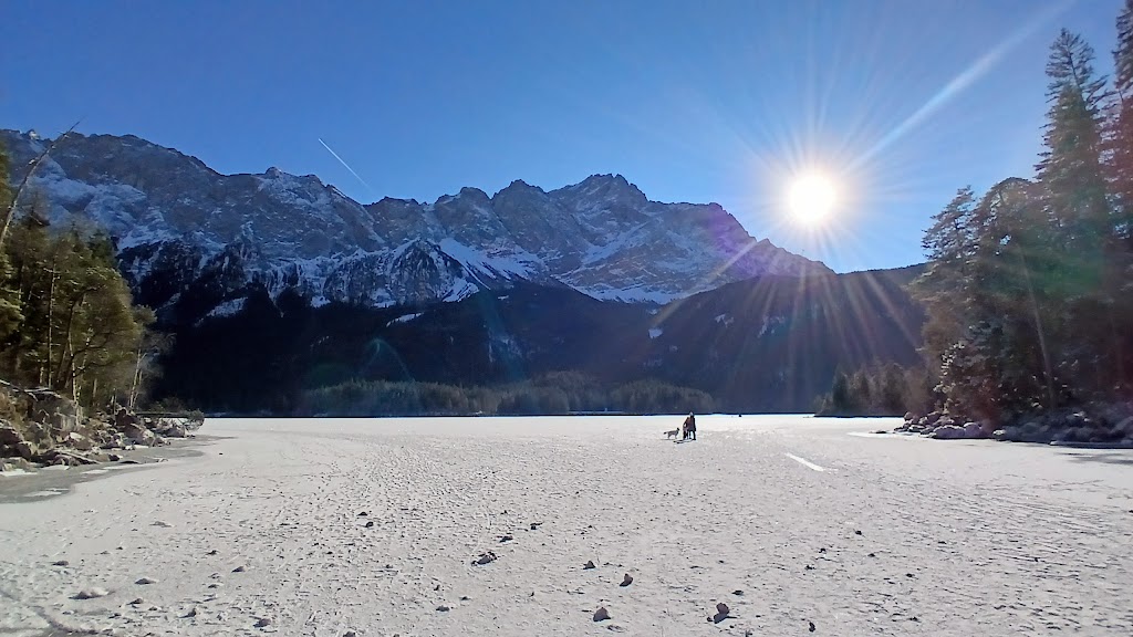 Eibsee pod Zugspitze je zamrzlé 14.1.2025 a přejde se po ledě.