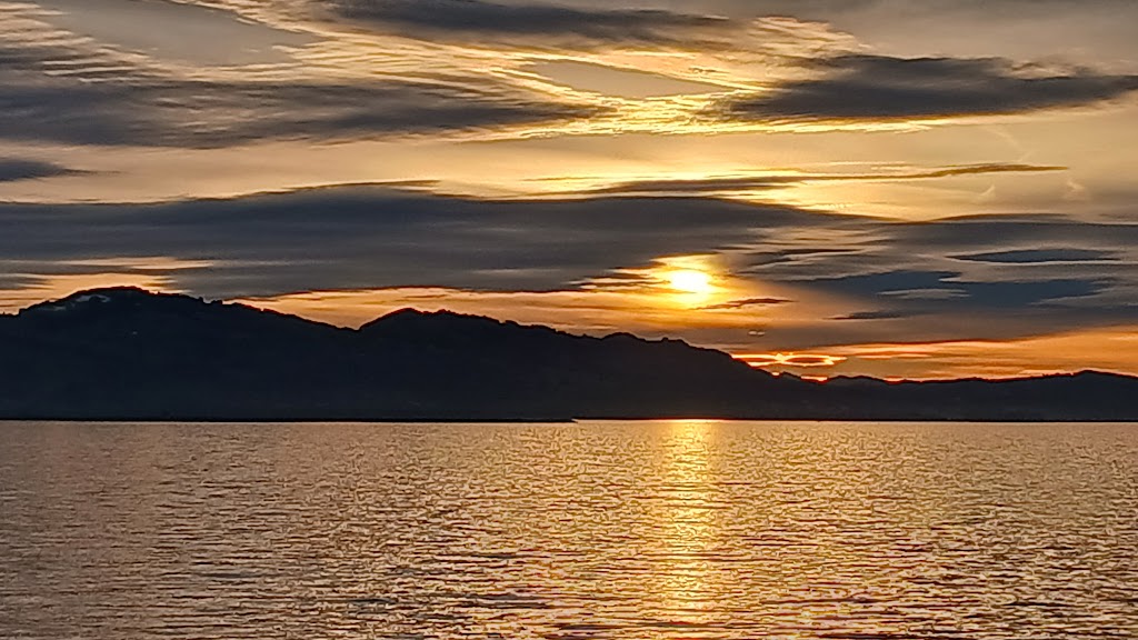 Foto ukazuje západ slunce nad Bodensee od nádraží Lindau-Insel 24.1.2025. Vzadu je Švýcarsko.