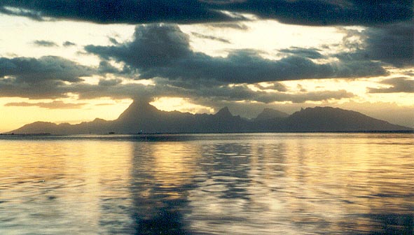 Západ slunce nad ostrovem Moorea. Pohled z Papeete, Tahiti roku 1988. Dole na webstránce je přehrávadlo,