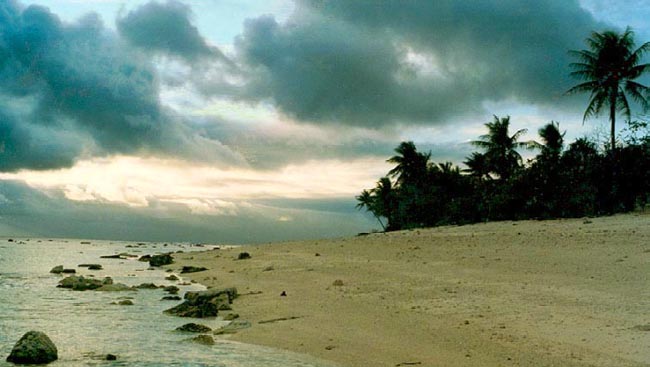 Západ slunce nad atolem Auira, 100 metrů od Maupiti. 1996. Dole na webstránce je přehrávadlo,
