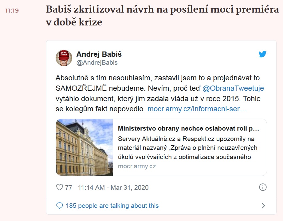 A z Maďarska a Polska jsme si příklad už dávno vzali, totalita v ČR už klepe na dveře. Ministr obrany navrhuje v krizi posílení pravomocí premiéra na úkor parlamentu.