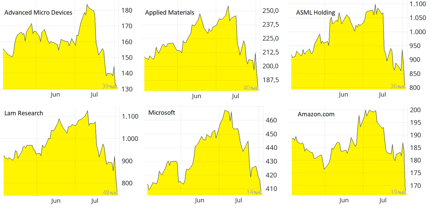 Pokles kurzu 2.8.2024: Amazon.com -8,7 %, ASML Holding -8,4 %, Lam Research -8,1 %, Applied Materials -7,3 %, Palantir Technologies -5,1 %,