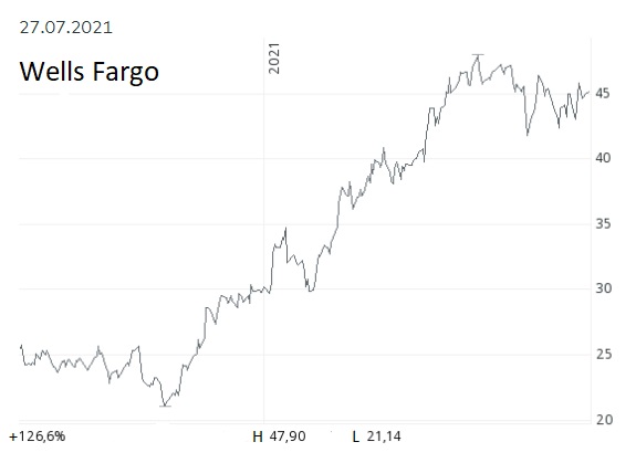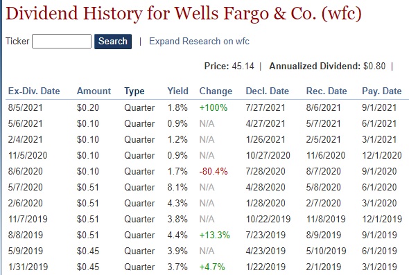 Když má banka Wells Fargo od orgánů dovoleno platit slušnou dvidendu, zvyšuje 5.8.2021 dividendu o 100%.