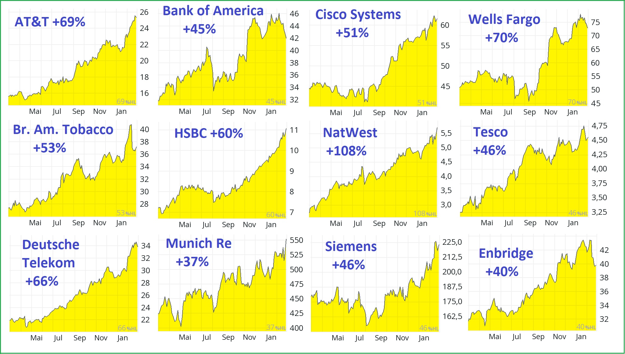 NatWest Grp. +55%, HSBC Holdings +48%, Iberdrola +36%, BNP Paribas +34%, Allianz 32%,
