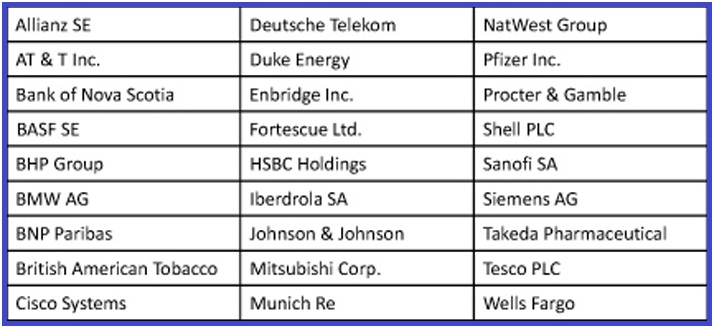 2024: Allianz, AT&T, Bank of Nova Scotia, BASF, BHP Group, BNP Paribas, Pfizer