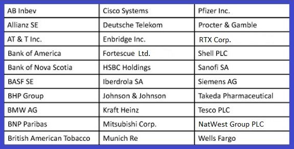 Raytheon Technologies, Wells Fargo, British American Tobacco, HSBC Holdings, Shell, Tesco, Allianz, BASF, BMW, Deutsche Telekom, Munich Re, Siemens,