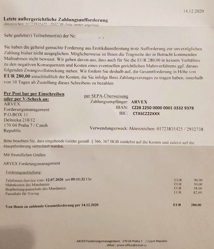 Podvodníci české firmy ARVEX z Prahy posílají dopisy německým domácnostem. Můj přítel už dvakrát dostal poštu. Říkají, že měl sex po telefonu. Ale