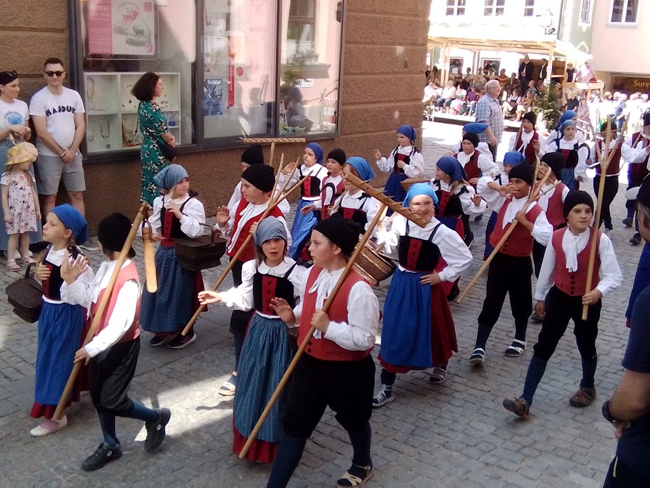 Průvod sředověce oblečených dětí a lidí a muzikantů končí kilometr od městských hradeb na velkém prostoru s kolotoči a s velikou hospodou pod plachtou. :info: A hrají do pochodu i staré české písně, jako ''Muziky muziky'' a ''Zlatá Praha''. :info: